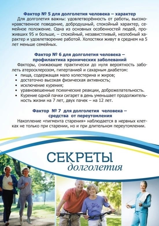 Предлагаем вам памятки, в которых изложены факторы, способствующие долголетию. Сохраняйте себе на стену, делитесь информацией со своими родными старшего поколения, живите долго и будьте здоровы!