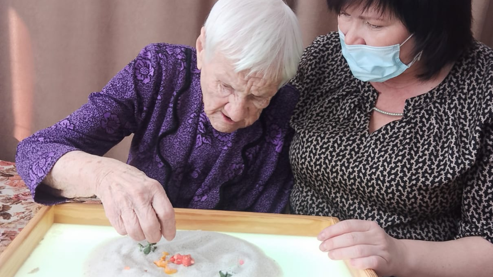 Вот и сегодня под руководством психолога Надежды Баглай получатели социальных услуг в очередной раз с радостью провели занятие по песочной терапии.