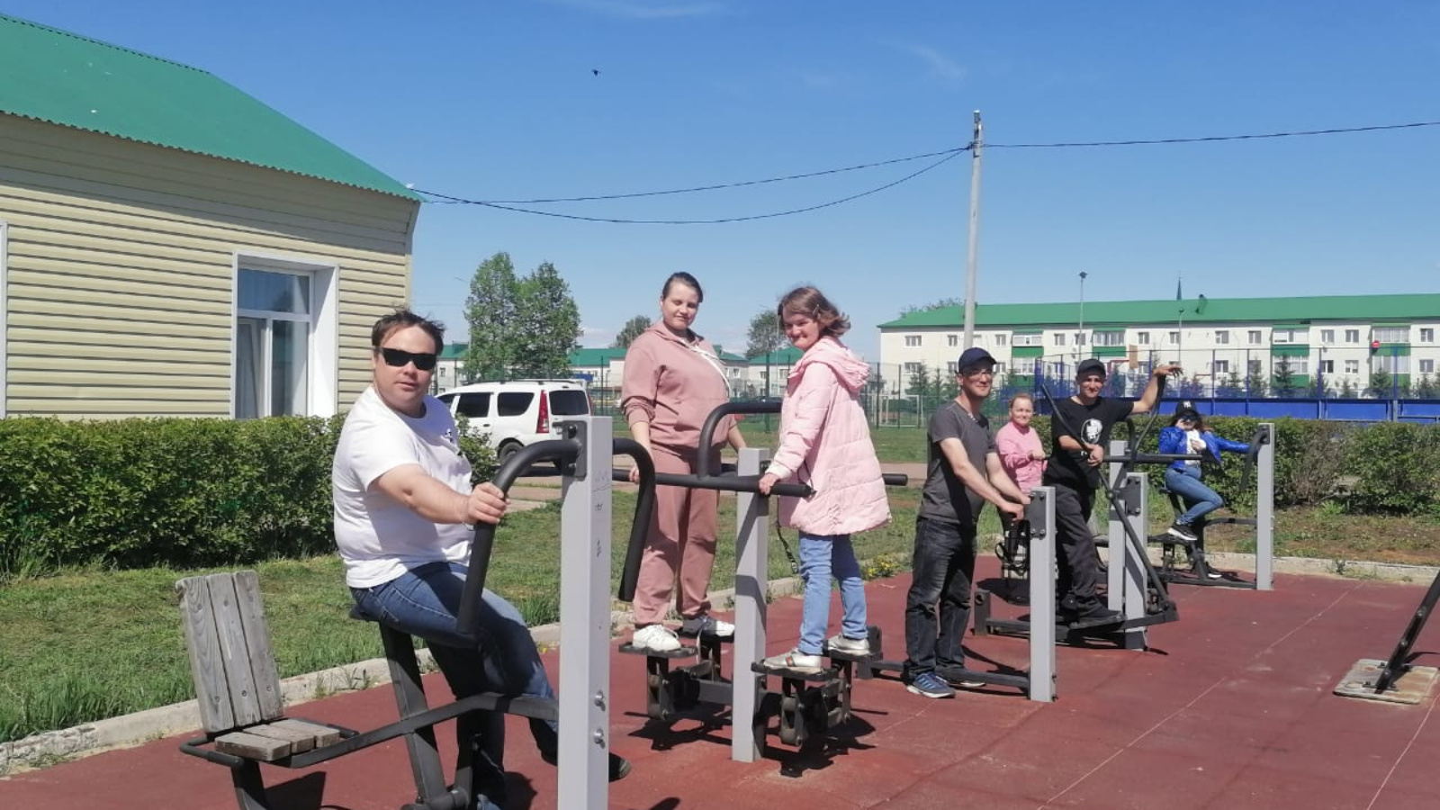 В этот раз физическую зарядку провели на спортивной площадке, где ребята получили возможность размяться и заняться на тренажерах.