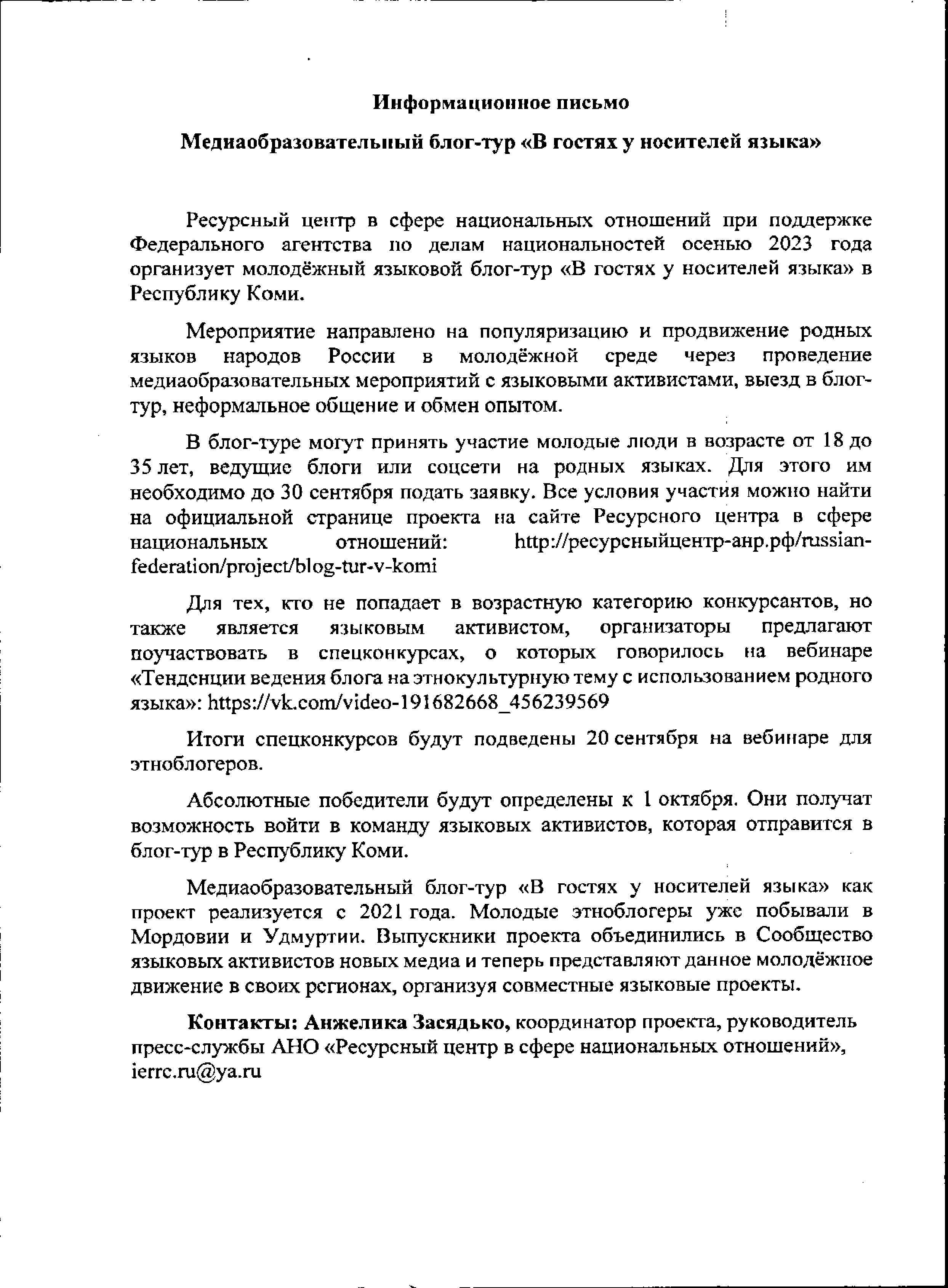 О проведении конкурсного отбора молодых языковых активистов для участия в медиаобразовательном блог-туре «В гостях у носителей языка»