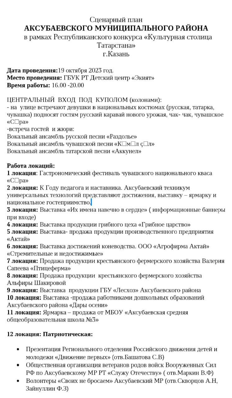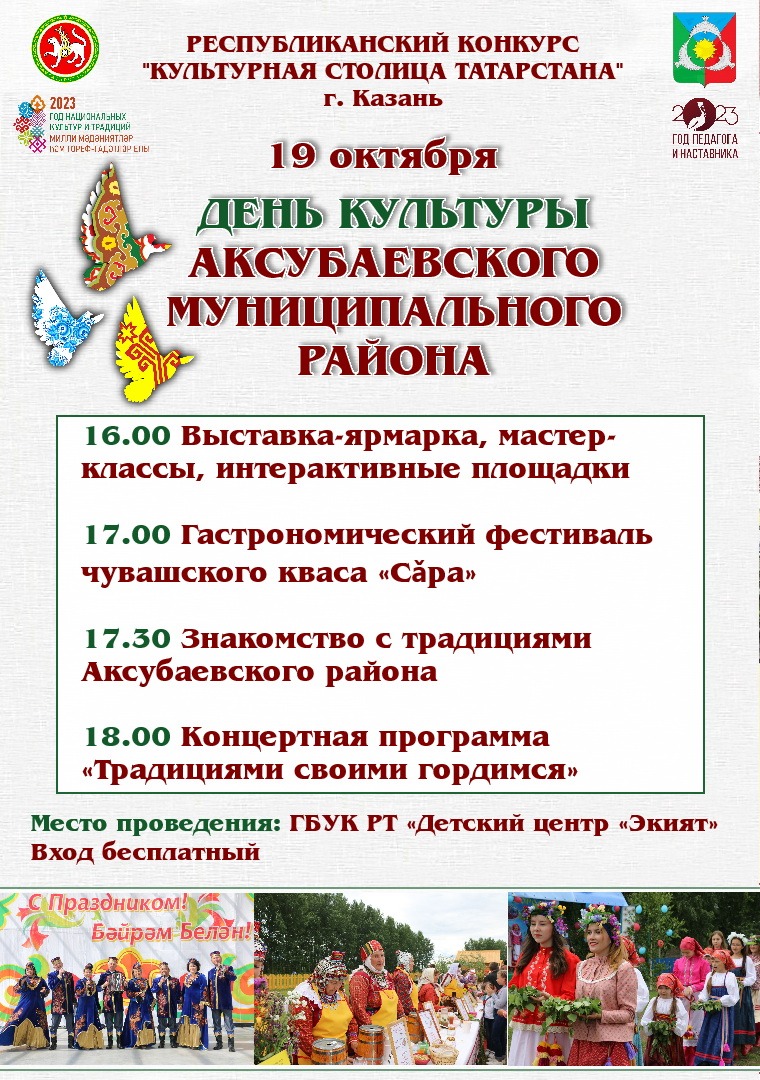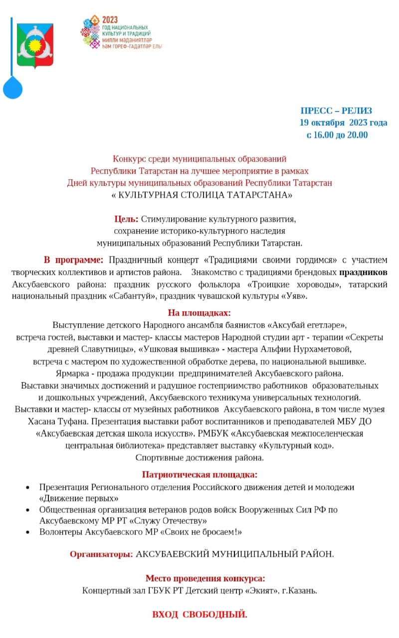 19 октября в г. Казань в ГБУК РТ «Детский центр «Экият» мы будем представлять наш любимый Аксубаевский район на республиканском конкурсе «Культурная столица Татарстана».