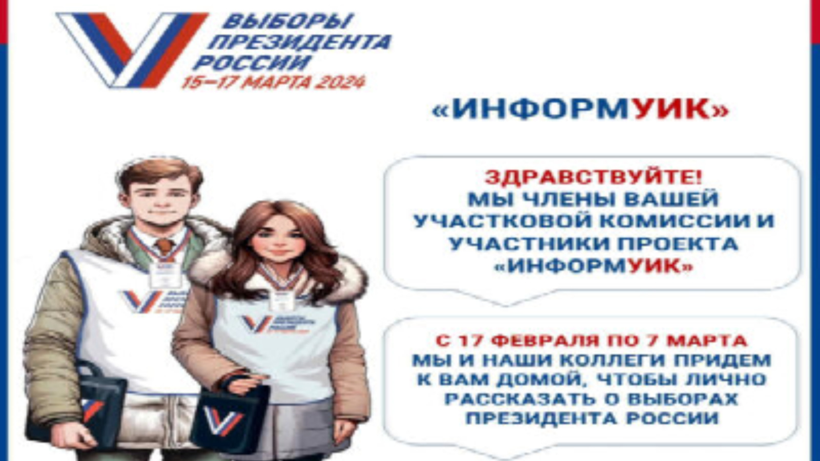 Члены участковых избирательных комиссий проведут адресное информирование и оповещение избирателей о сроках, времени, месте, формах голосования на выборах Президента Российской Федерации с использованием специального мобильного приложения «ИнформУИК». Члены комиссии будут одеты в специальные жилеты с символикой президентских выборов, будут иметь при себе именной бейдж и удостоверение члена избирательной комиссии.