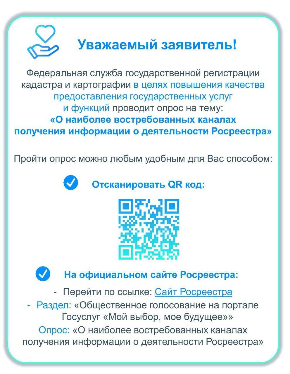 Для участия в опросе необходимо отсканировать QR – код (макет листовки прилагается) или перейти по ссылке: https://pos.gosuslugi.ru/lkp/polls/407564/.