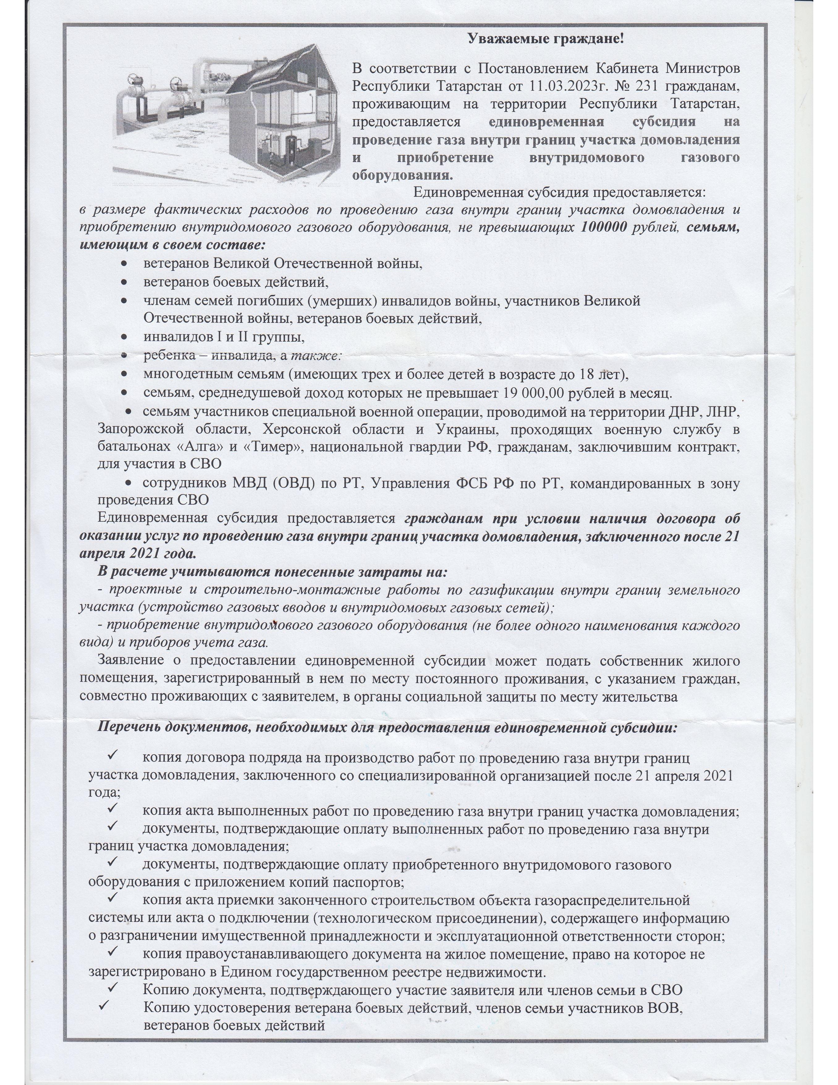 Единовременная субсидия на проведение газа внутри границ участка домовладения и приобретение внутридомового газового оборудования.