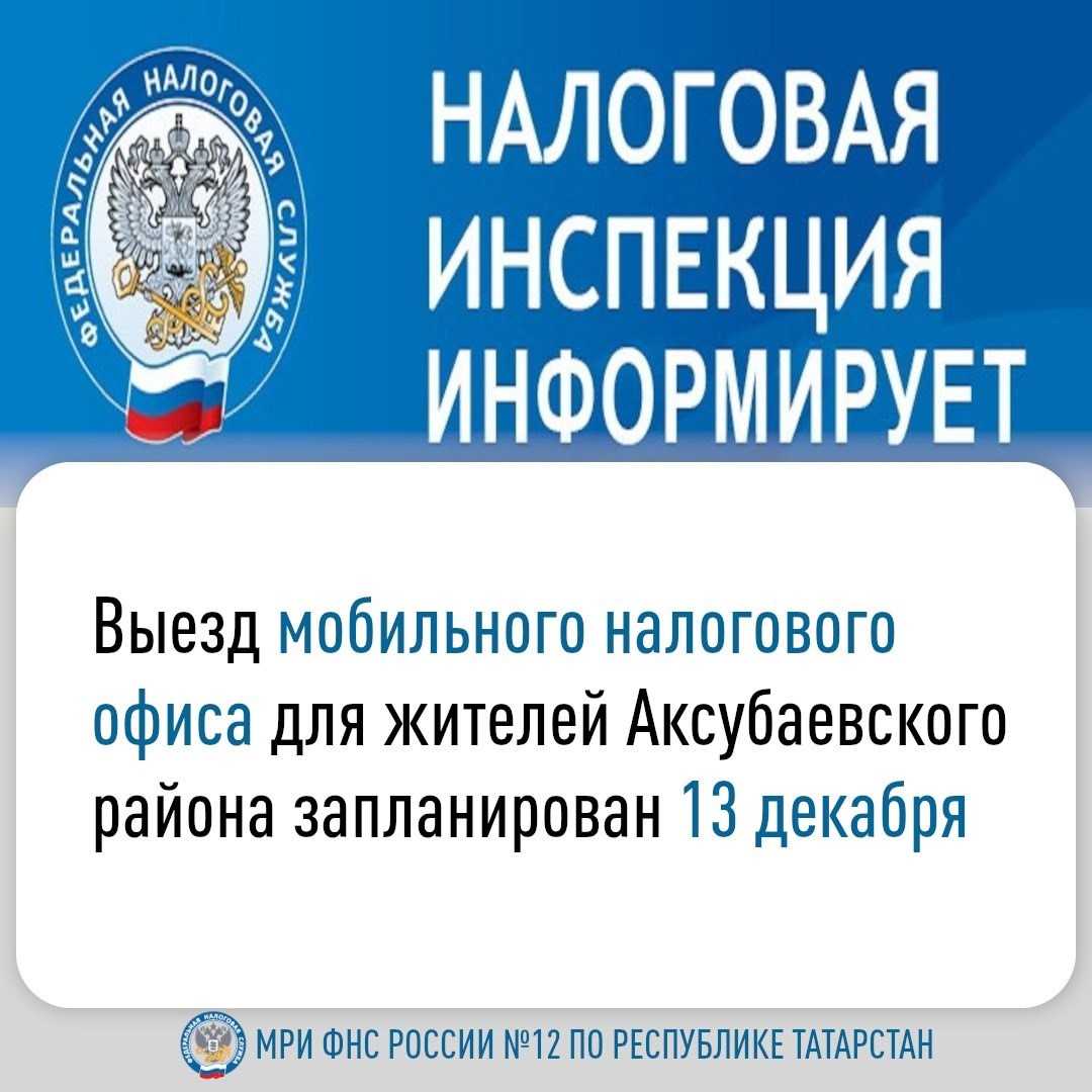 13 декабря с 8:30 до 16:30 сотрудники Межрайонной ИФНС России №12 по Республике Татарстан приглашают налогоплательщиков посетить мобильный налоговый офис. Мероприятие состоится по адресу: пгт Аксубаево по адресу: ул. Ленина, д.8 (здание исполнительного комитета Аксубаевского муниципального района Республики Татарстан).