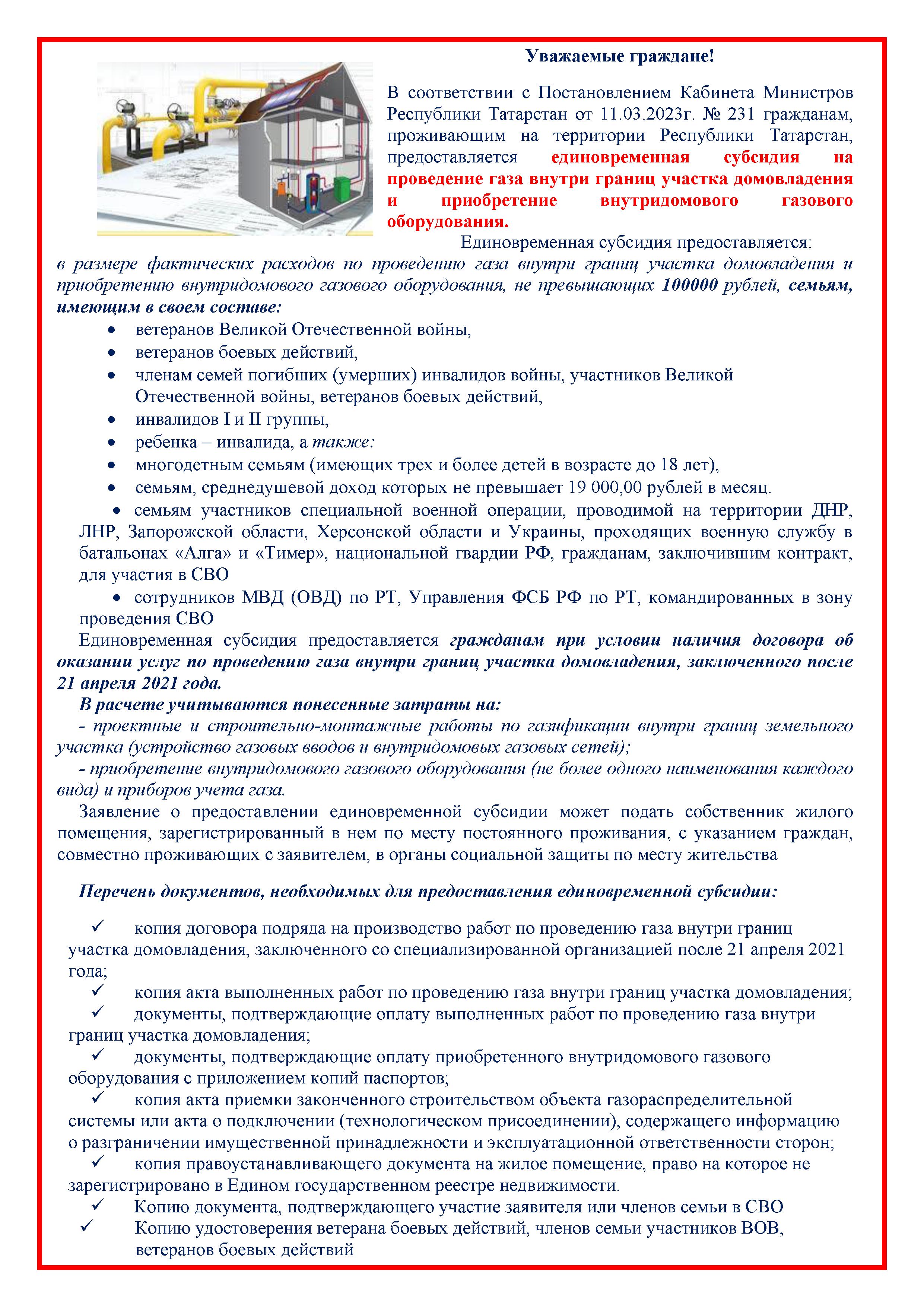 Единовременная субсидия на проведение газа внутри границ участка домовладения и приобретение внутридомового газового оборудования.