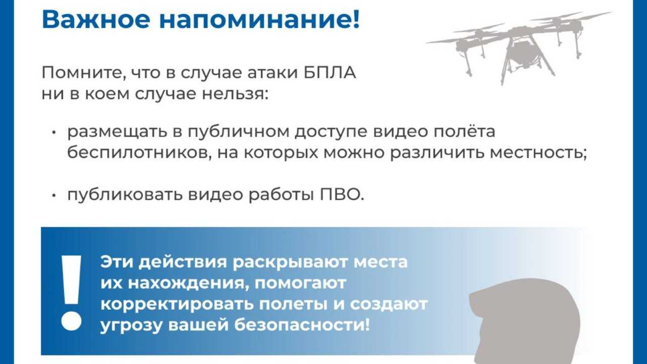 Как неоднократно предупреждали, в случае атаки БПЛА крайне важно не размещать в публичном доступе видео полёта беспилотников, на которых можно различить местность по любым ориентирам. И ни в коем случае не публиковать видео срабатывания ПВО. Это раскрывает места их размещения, помогает корректировать полеты и угрожает безопасности граждан Республики Татарстан.