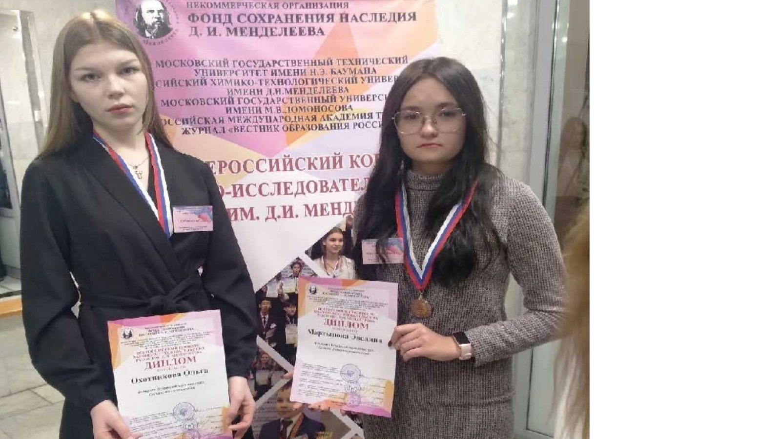 В Москве завершился ХХI Всероссийский конкурс научно-исследовательских работ имени Д. И. Менделеева. На конкурс были приглашены более 1500 участников из 63 регионов России, участники были распределены по 26 секциям в зависимости от направления исследования. Работы конкурсантов охватывали широкий спектр тем от истории семьи до создания БПЛА. В числе приглашенных финалистов конкурса были ученицы 10 класса МБОУ «Сунчелеевская СОШ им. академика Н.Т.Саврукова» Охотникова Ольга и Мартынова Эвелина, которые работали в секциях «Литературоведческая» и «Филологическая». Девушки привезли с конкурса дипломы финалистов Всероссийского конкурса и медали «Юный исследователь». Грамотой награждена и педагог-наставник, подготовивший учениц к конкурсу – учитель Сунчелеевской средней школы Матюкова Наталья Никоноровна.