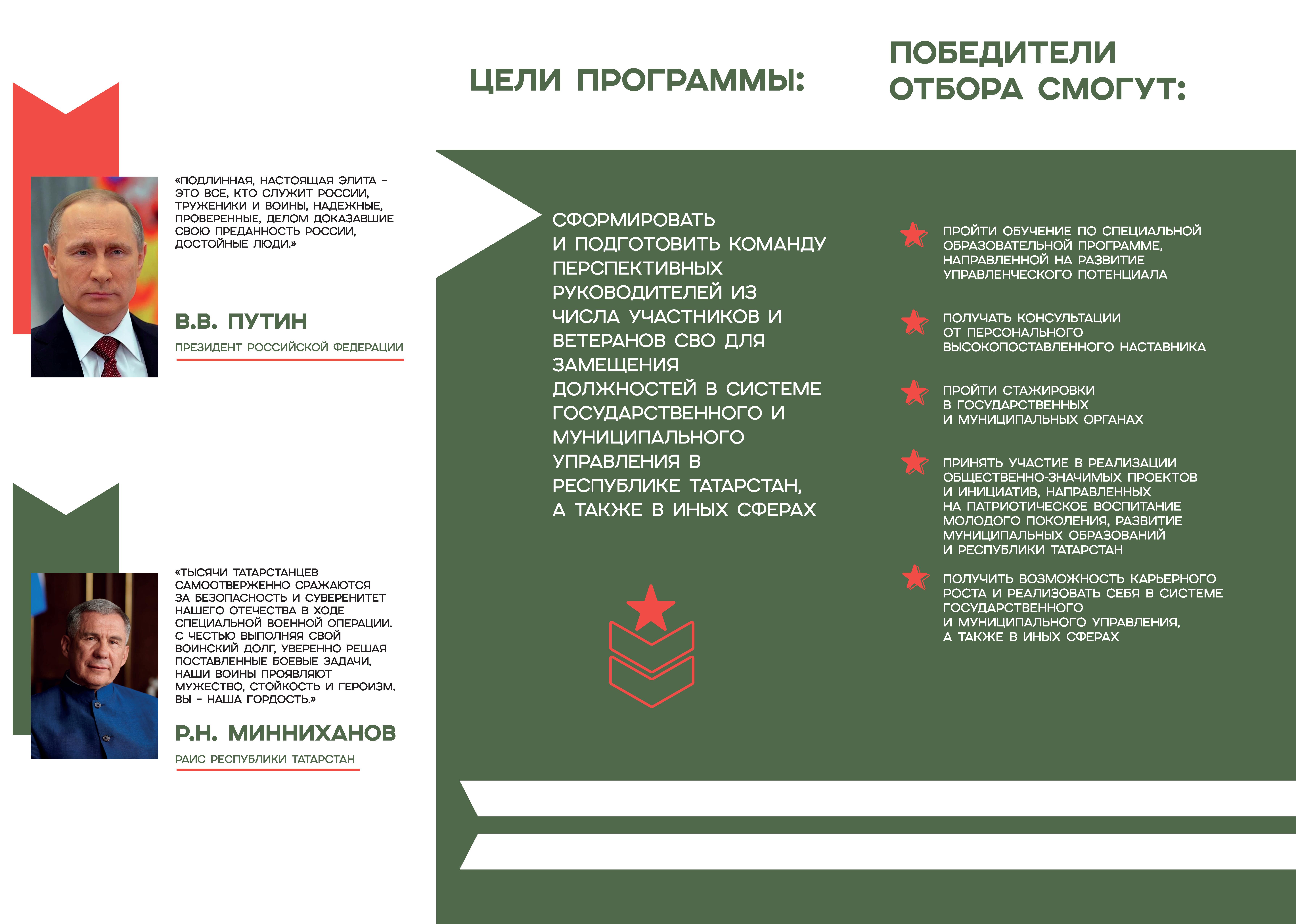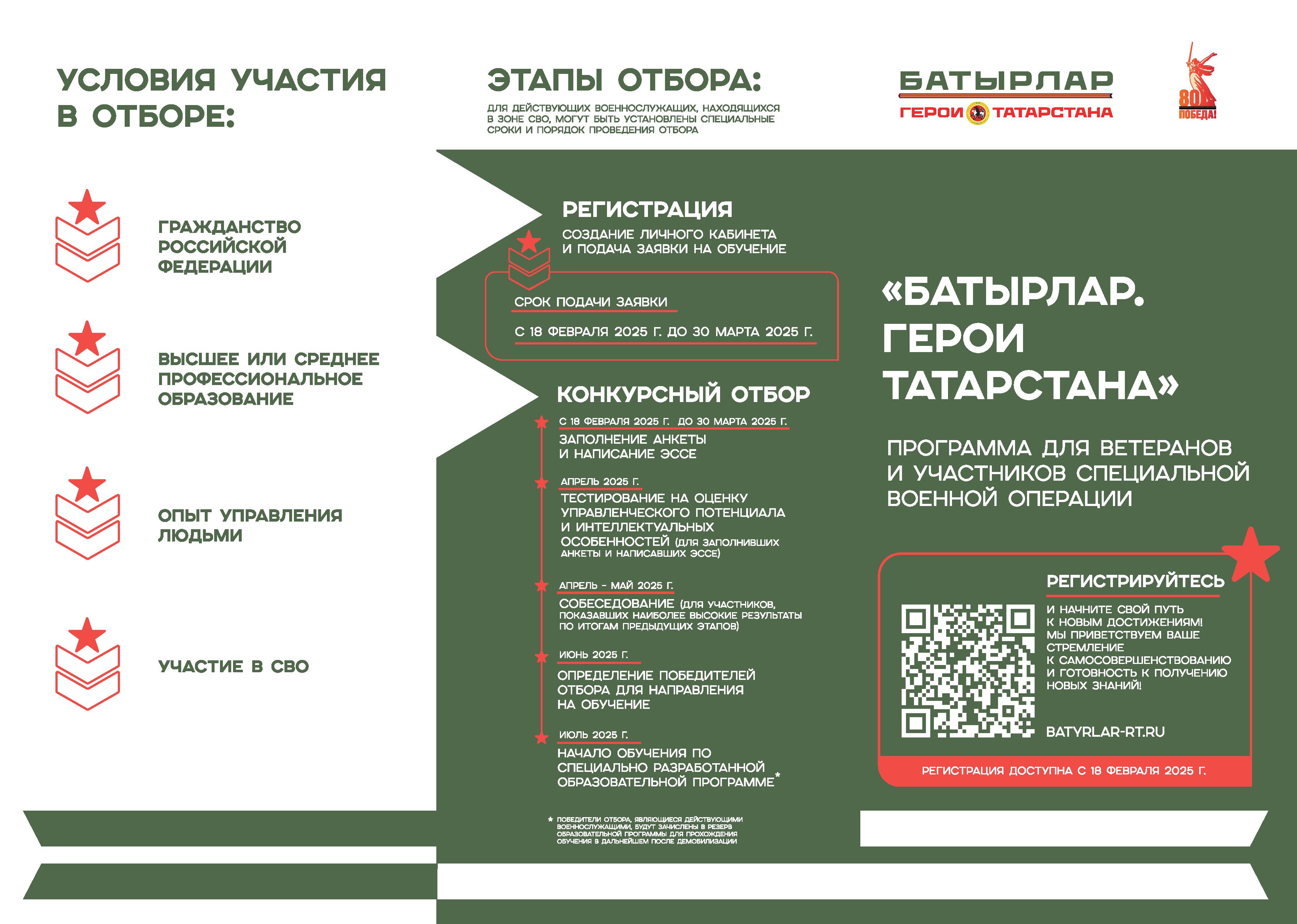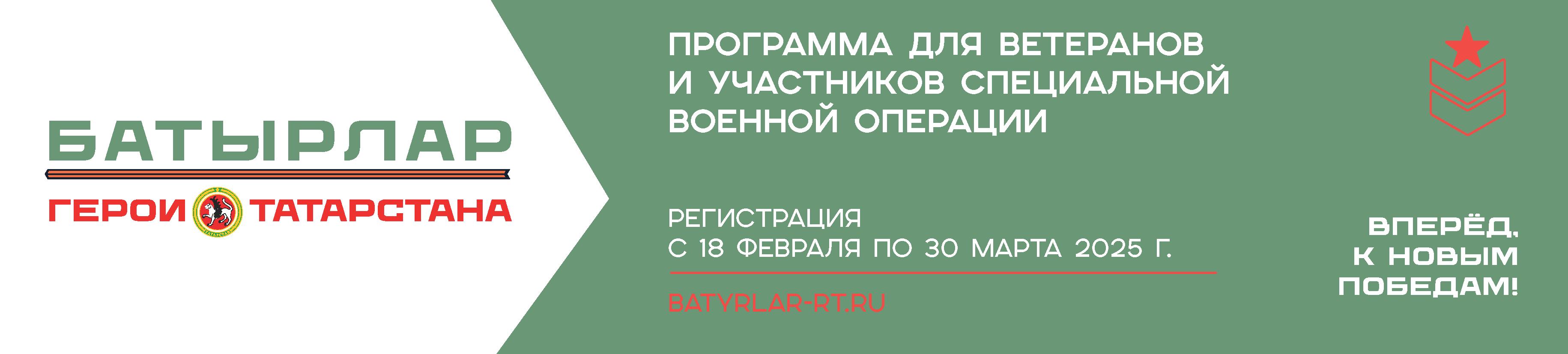 В Год защитника Отечества с 18 февраля мы запускаем программу для ветеранов и участников специальной военной операции «Батырлар. Герои Татарстана» – аналог федеральной программы «Время героев», разработанной по поручению Президента страны. Ее цель – формирование и подготовка команды перспективных руководителей для замещения должностей в системе государственного и муниципального управления, а также в иных сферах. Вся необходимая информация размещена на интернет-сайте https://batyrlar-rt.ru.