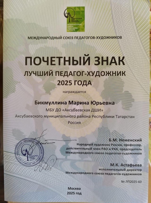 Директор, педагог художественного отделения Аксубаевской детской школы искусств Бикмуллина Марина Юрьевна признана "Лучшим педагогом-художником 2025 года" по версии Международного союза педагогов- художников.