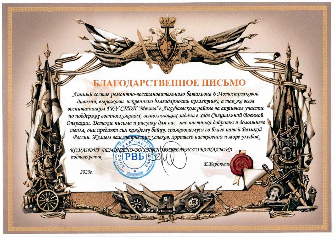 Коллективу и воспитанникам Социального приюта для детей и подростков «Мечта» Аксубаевского муниципального района выразили слова благодарности за активное участие по поддержке военнослужащих, выполняющих задачи в ходе Специальной Военной Операции от личного состава ремонтно-восстановительного батальона 6 Мотострелковой дивизии. Также личный состав поблагодарил воспитанников за детские рисунки и письма, которые дарят частичку доброты и домашнего тепла и придают сил каждому бойцу. Командир и личный состав пожелали творческих успехов, хорошего настроения и море улыбок.