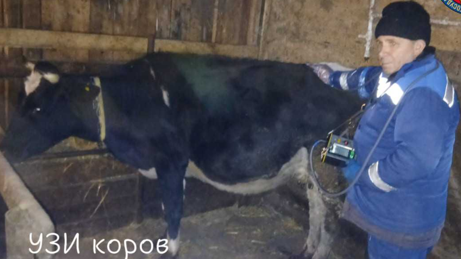 Ветеринарный врач - заведующий Тимошкинским ветучастком Фархать Алимьеков проводит диагностику стельности коров и телок с помощью УЗИ сканера. Работа проводится в личных подсобных хозяйствах.