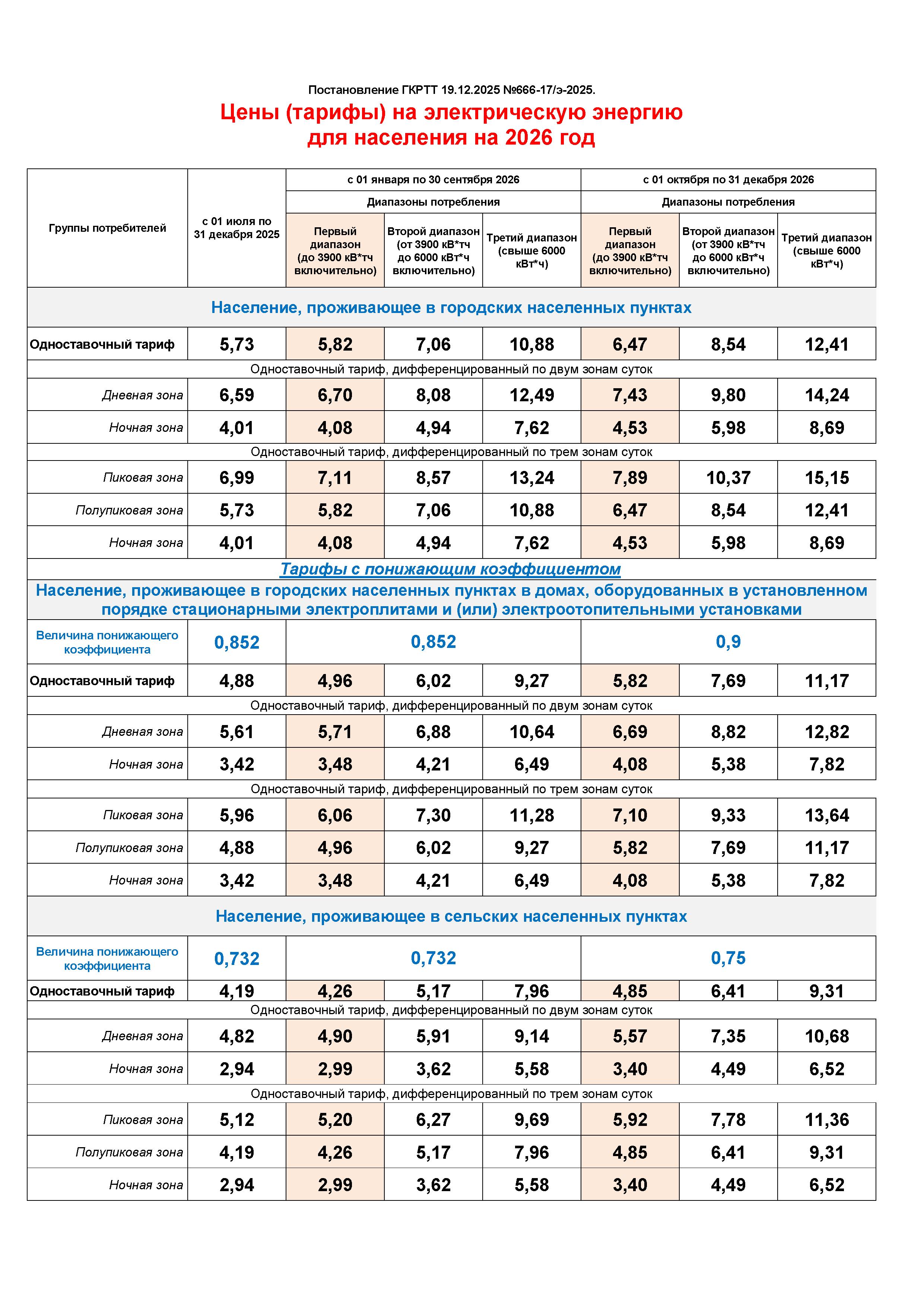 Цены (тарифы) за электроэнергию для населения на 2026 год