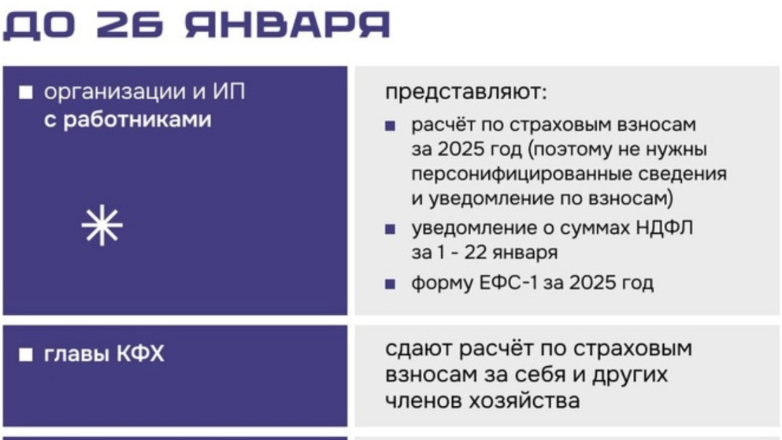 изменить налоговый режим на следующий год по своему желанию в ряде случаев можно не позже 12 / 15 января работодатели сдают расчет по страховым взносам за 2025 год (важно для включения в реестр субъектов МСП) у многих добавляются квартальные и годовые платежи и отчеты.