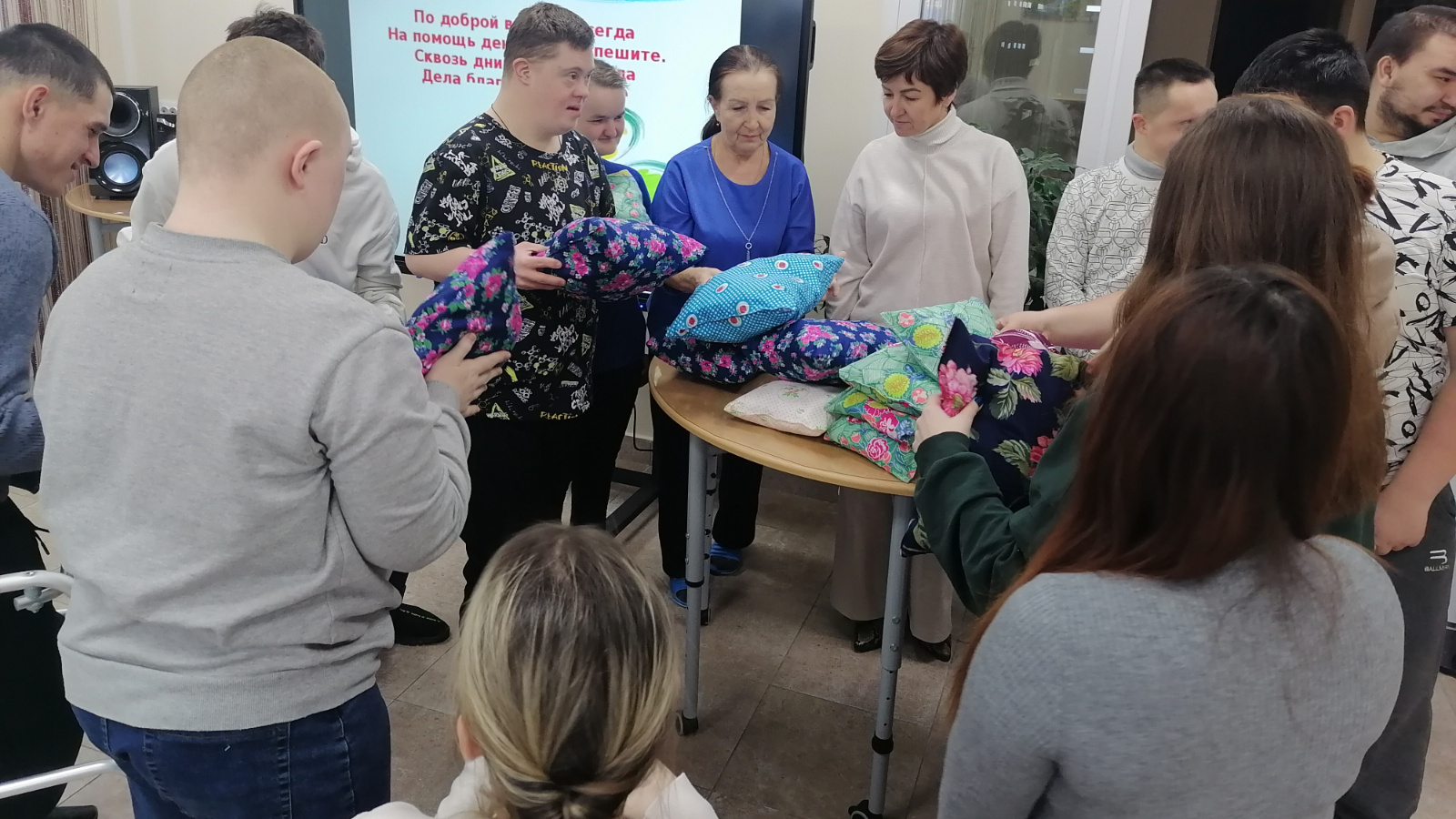 В Центре волонтёров женщины шьют спальные мешки, а наши ребята в швейной мастерской взяли на себя не менее важную задачу — изготовление специальных подушек. Валентина Ивановна показала все тонкости работы, и дело закипело!