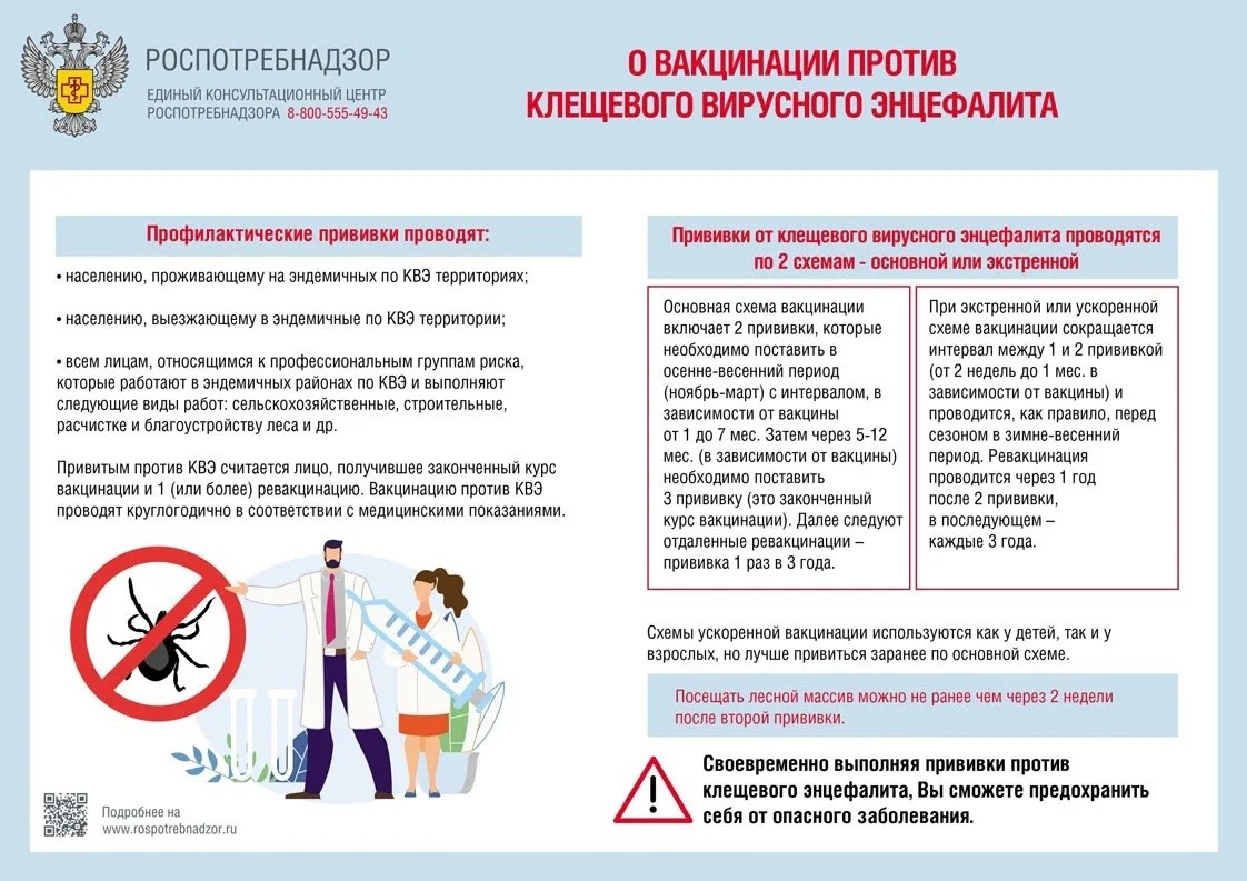 Чтобы поддержать иммунитет против клещевого вирусного энцефалита - важно через год сделать ревакцинацию. Последующие ревакцинации проводятся каждые 3 года. Специалисты рекомендуют не тянуть с вакцинацией. Оптимально прививаться с ноября по март. Если времени мало, возможна ускоренная схема: две прививки с интервалом в две недели. Ревакцинация проводится раз в три года.