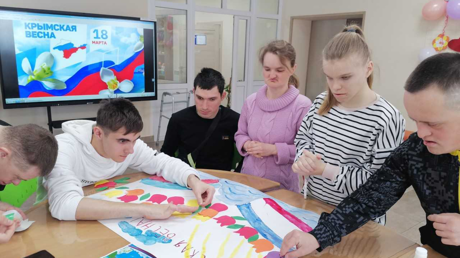 Завершилось мероприятие созданием коллективного плаката «Крымская весна». Каждый участник внёс в общую работу свою частичку, украсив плакат рисунками и тюльпанами. Этот творческий процесс стал наглядным примером дружбы и единения.