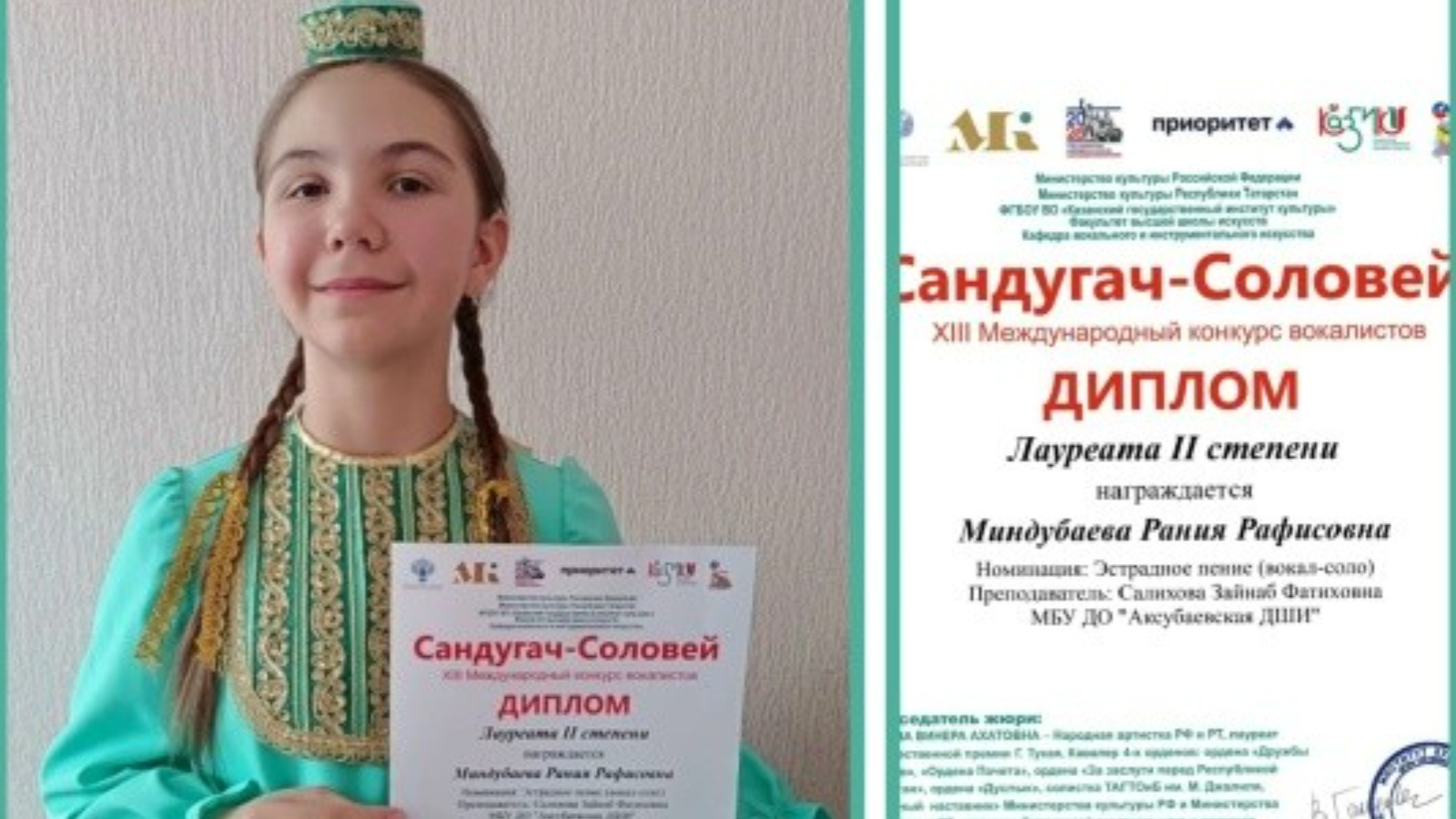 Лауреат 3 степени Нурдинова Жасмин Преподаватель Салихова Зайнаб Фатиховна