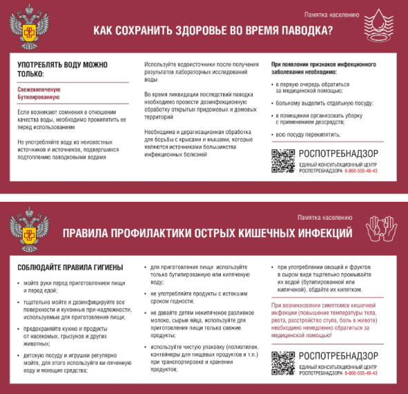 В целях предупреждения и возникновения и распространения массовых инфекционных заболеваний (отравлений) в связи с возможностью подтопления территорий населенных пунктов и источников водоснабжения во время прохождения ледохода и паводковых вод Нурлатский территориальный отдел Роспотребнадзора по Республике Татарстан (Татарстан) рекомендует о необходимости выполнять следующие гигиенические требования: