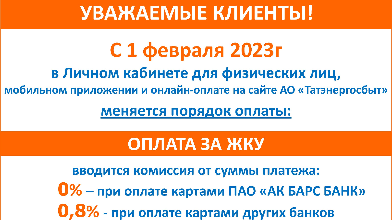 ХӨРМӘТЛЕ КЛИЕНТЛАР! 2023 елның 1 февраленнән физик затлар өчен шәхси кабинетта, мобиль кушымтада һәм онлайн-түләүдә " Татэнергосбыт» АҖ сайтында түләү тәртибе үзгәрә: ТКУ ӨЧЕН ТҮЛӘҮ түләү суммасыннан комиссия кертелә: 0% - «АК БАРС БАНК»ГАҖ карталары белән түләгәндә 0,8% - бүтән банклар картасы белән түләгәндәЭЛЕКТР ӨЧЕН ТҮЛӘҮ «Татэнергосбыт»АҖ белән турыдан-туры электр белән тәэмин итү килешүләре булган клиентлар өчен. Теләсә нинди банк карталары белән түләгәндә комиссия юк.