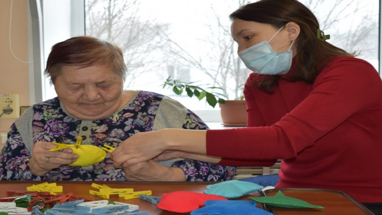 Социаль хезмәтләрне аз мобильле алучылар белән озак вакыт тәрбияләү системасы кысаларында хезмәт терапиясе буенча индивидуаль дәресләр. Вак моториканы күнегүләр ясау максаты белән прищепкалар белән күнегүләр ясадылар.