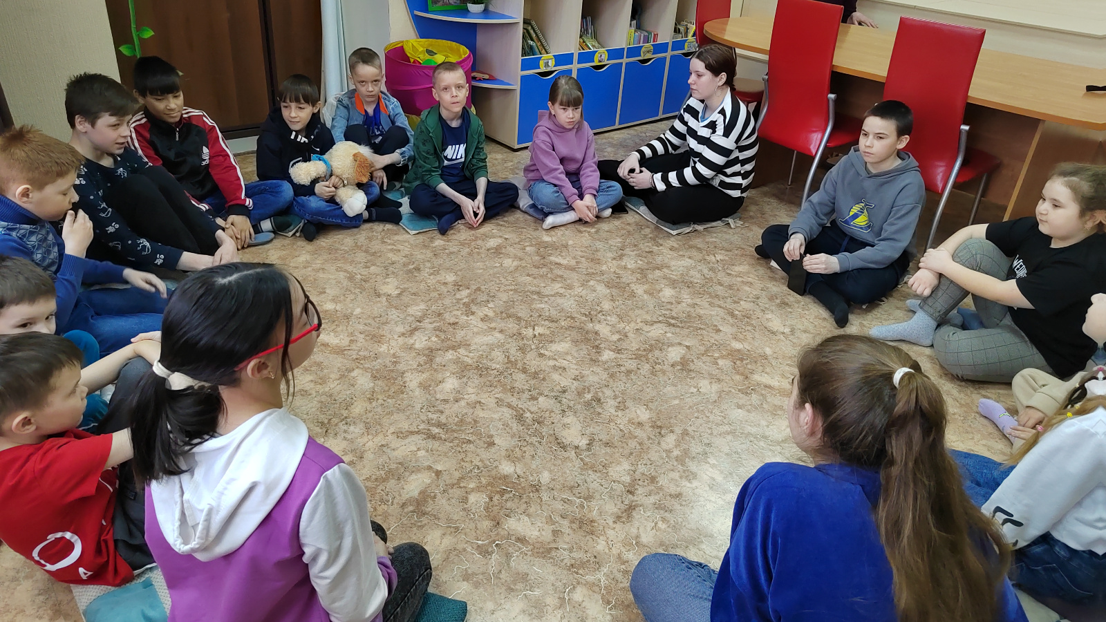 Башта сузык авазлар әйтелешенә сәхнә сөйләме буенча сөйләмгә керештеләр: и, э, а, у, ы; «т», «д», тартыклар әйтелеше, шулай ук балалар хыял үсешенә күнегүләрдә, музыка астына алып баручының хикәясен тыңладылар, ә аннары үз хыялында картинаның дәвамын күз алдына китерделәр. Дәресләр барышында әкият терапиясе узды. Балаларның эмоциональ сәламәтлеген саклауда әкиятләр зур роль уйный. Китапханәче балаларга әкиятнең нәрсә икәнлеге, аларның нинди кыяфәттә булулары турында сөйләде. Балаларга берничә биремне үтәргә тәкъдим ителде: «әкият сөйлә», «әкият язабыз», «әкият уку» күнегүләрен, алар бик яхшы башкардылар. Ярдәмче атрибутлар ярдәмендә катнашучылар Идел буе халыкларының Дуслык һәм үзара ярдәм итүне өйрәтүче «ятим төлке» әкиятен җиңделәр. Әкият ярдәмендә балалар төп геройлары күрсәткән тәртип нормаларын җиңел үзләштерәләр. Әкият персонажына әверелү, бала үзенең куркуларын, шәхеснең тискәре сыйфатларын җиңә, үз-үзен тотышын үзгәртә, шулай ук эмоциональ халәтен нормальләштерә ала. Ахырда дисклардан Балык ясау буенча мастер-класс узды. Дисклардан һәм төсле кәгазьдән эшләнгән; бу күзаллауны, кул моторикасын, сәнгать күнекмәләрен, коллективта эшләү осталыгын үстерә; балалар рәхәтләнеп эшкә керештеләр. Эш барышында ярдәм иттеләр, бер-берсенә киңәш иттеләр. Нәтиҗәдә, балыкларның барысы да шат күңелле, матур, һава йөзгечләре белән, көмеш тәңкәле булып чыкты. Барысы да тырышты.