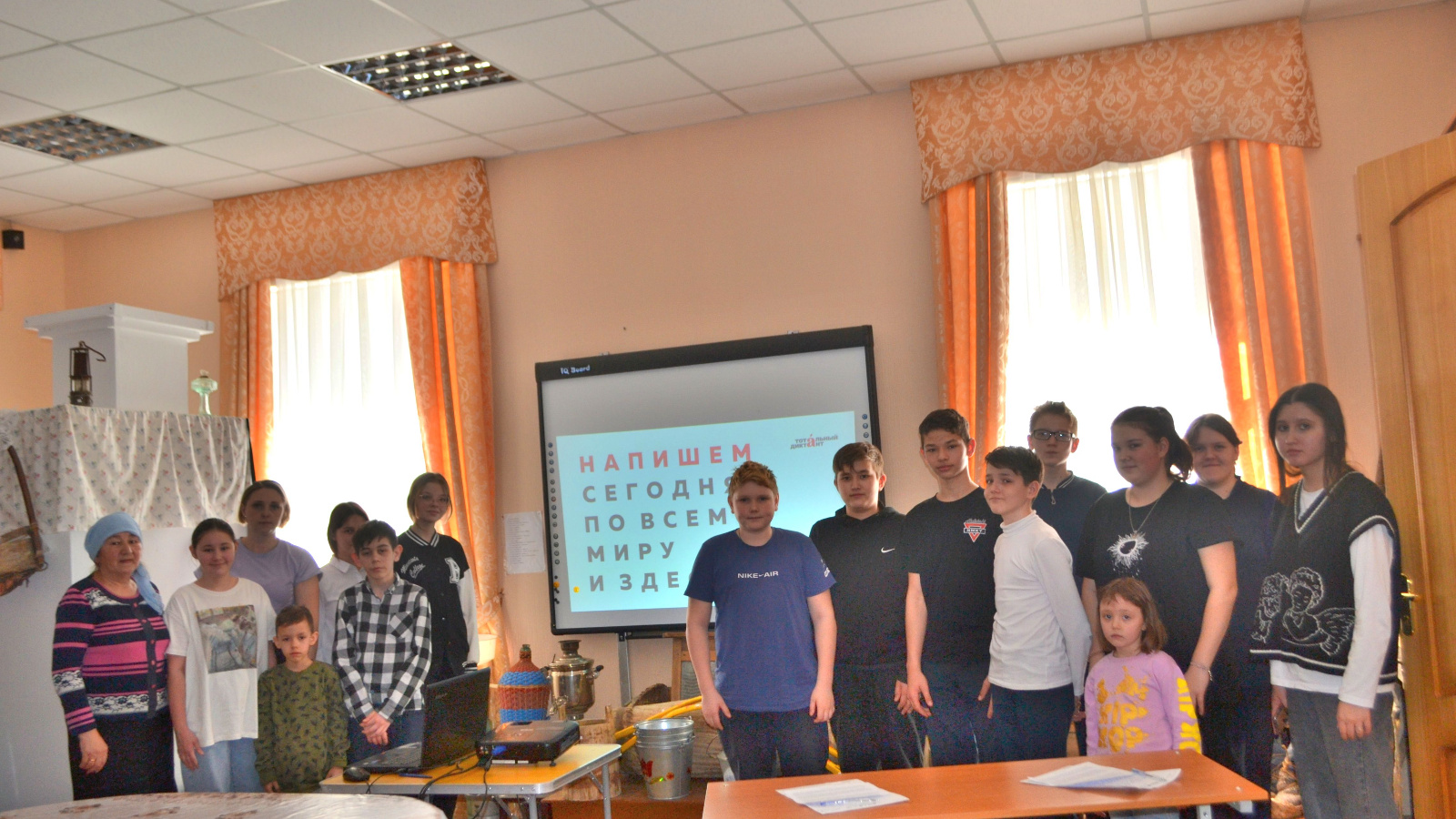 Диктантны өлкәннәр дә, мәктәп укучылары да язган. Музей директоры Наталия Геннадьевна диктант текстын диктантлый, ә филолог Бобкова Галина Павловна эшләрне тикшерә. Тоталь диктант теләгән һәркем өчен ирекле диктант формасындагы еллык мәгърифәтчелек акциясе. Акциянең максаты — һәр кеше өчен грамоталы булуның мөһимлеген күрсәтү; рус теле белән шөгыльләнү җиңел түгел, әмма мавыктыргыч һәм файдалы дип ышандыру; русча яза һәм сөйләшергә теләгән яки белгән һәркемне берләштерү. 50 кеше катнашты.