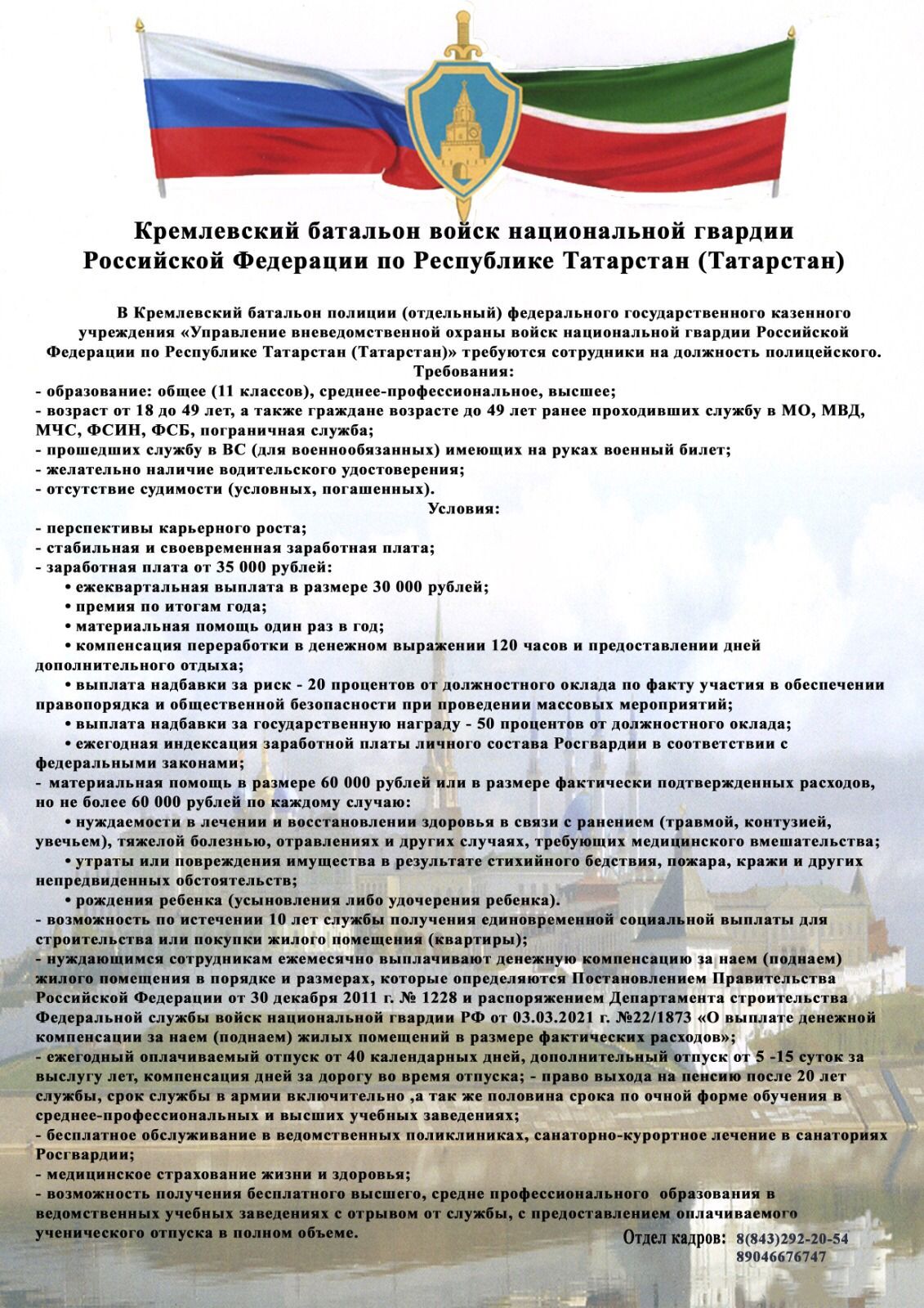 «Татарстан Республикасы буенча Россия Федерациясе Милли гвардиясе гаскәрләрен ведомстводан тыш саклау идарәсе " Федераль дәүләт казна учреждениесенең Кремль полиция батальонында (аерым) хезмәт итү өчен кандидатлар сайлап алу турында