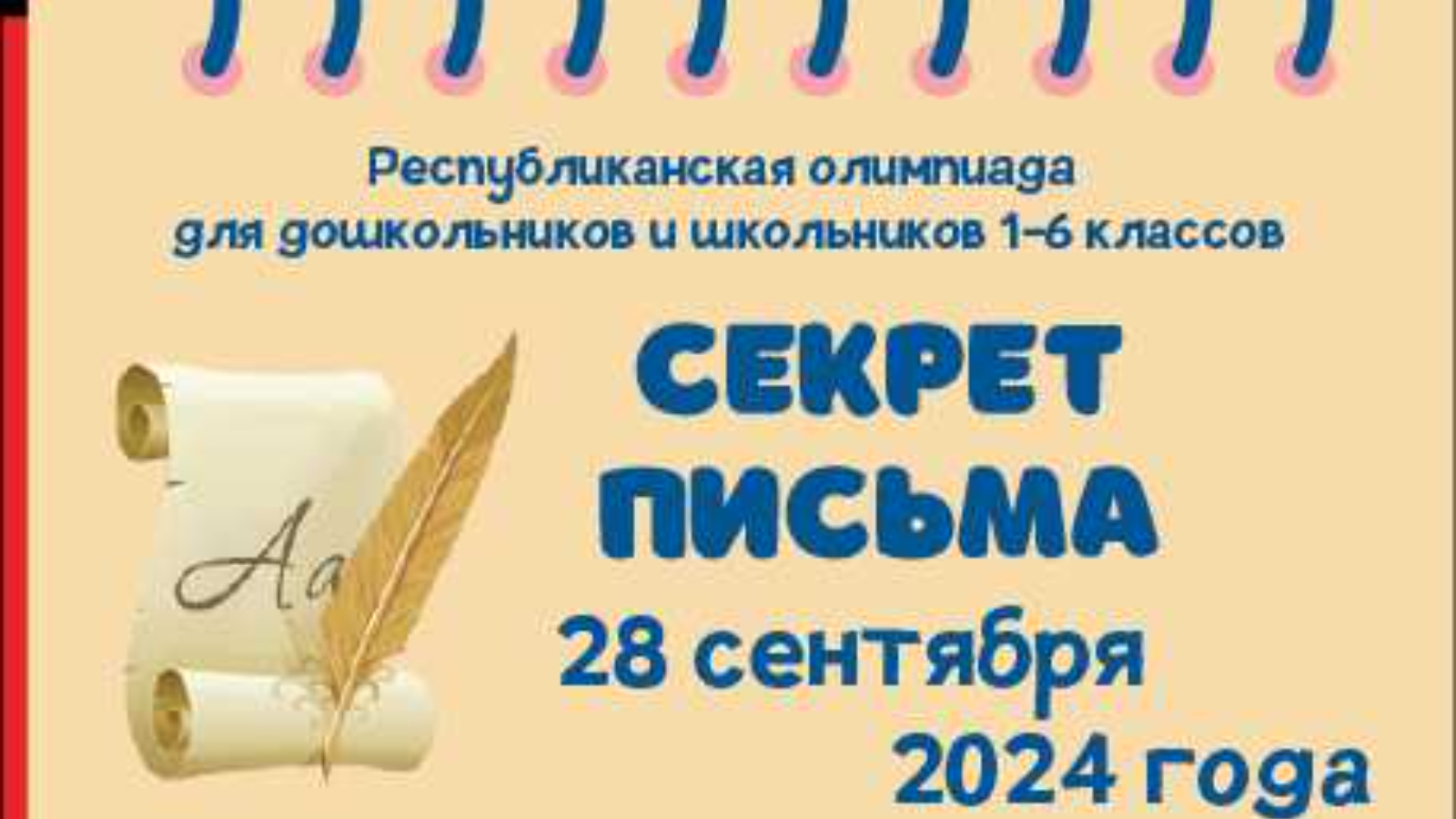 28 сентябрь көнне 8:30 сәгатьтә 1-6 сыйныф укучылары һәм мәктәпкәчә яшьтәге балалар өчен «Язу сере»республика олимпиадасының туры узачак Конкурс 3 этапта узачак: - 1 этап - өй эше; - 2 этап - иҗади бирем; - 3 этап-туры туры. Конкурста катнашучыларга читтән торып биремнәрне текстларны күчереп язу, язу элементларыннан композицияләр төзү һәм кулъязма шрифтлардан шрифт эшләү рәвешендә башкарырга тәкъдим ителә. Көндезге этапта язу буенча төрле биремнәр тәкъдим ителәчәк. Барлык катнашучыларга уңышлар телибез!