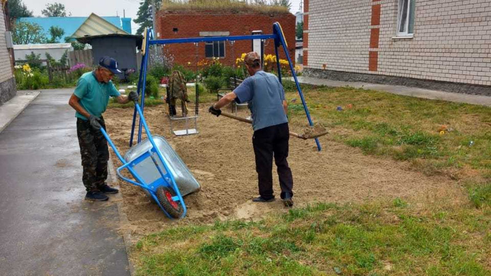 "Аксубай ш.т. идарәче компаниясе" ҖЧҖ Романов урамы, 16 йорт һәм Мазилин урамы, 46 йорт яны балалар мәйданчыгына ком өстәү һәм йомшарту эшләрен башкара.