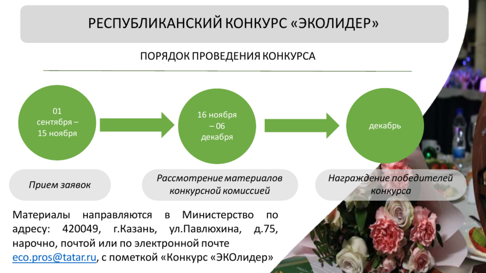 Татарстан Экология һәм табигый байлыклар министрлыгы ел саен үткәрелә торган «ЭКОлидер»республика конкурсына гаризалар кабул итә башлау турында игълан итте. Конкурста республиканың предприятиеләре, оешмалары, иҗтимагый берләшмәләре һәм актив гражданнары катнаша ала. Конкурс 2004 елдан бирле үткәрелә һәм Татарстанның әйләнә-тирә мохитен саклауга зур өлеш кертүчеләрне ачыклауга һәм бүләкләүгә юнәлдерелгән. Җиңүчеләр экология өлкәсендәге казанышларын танып кына калмыйча, уңышлы практикалары белән киң аудитория белән уртаклашу мөмкинлеге дә ала. Конкурска гаризалар 2025 елның 1 сентябреннән 15 ноябренә кадәр түбәндәге электрон почта аша кабул ителә: eco.pros@tatar.ru . » ЭКОлидер " — оешмалар һәм гражданнар өчен үзләренең экологик принципларга тугрылыкларын күрсәтү һәм туган якның тотрыклы үсешенә өлеш кертү өчен менә дигән мөмкинлек. Экологик инициативалар Татарстан Республикасының табигать ресурсларын саклауга һәм хәзерге һәм киләчәк буыннар өчен уңайлы әйләнә-тирә мохит булдыруга юнәлдерелгән үсеш стратегиясенең мөһим өлеше булып тора. Конкурсның барлык нечкәлекләре ТР Экология министрлыгы сайтында бар: https://eco.tatarstan.ru/2025-8618269.htm Җиңүчеләрне бүләкләү 2025 елның декабрендә булачак. Конкурска кушылыгыз һәм республиканың экологик хәрәкәтенең бер өлеше булыгыз! «Содействие»: финансирование для вашего бизнеса от Центра «Мой Бизнес» Фонда поддержки предпринимательства Республики Татарстан