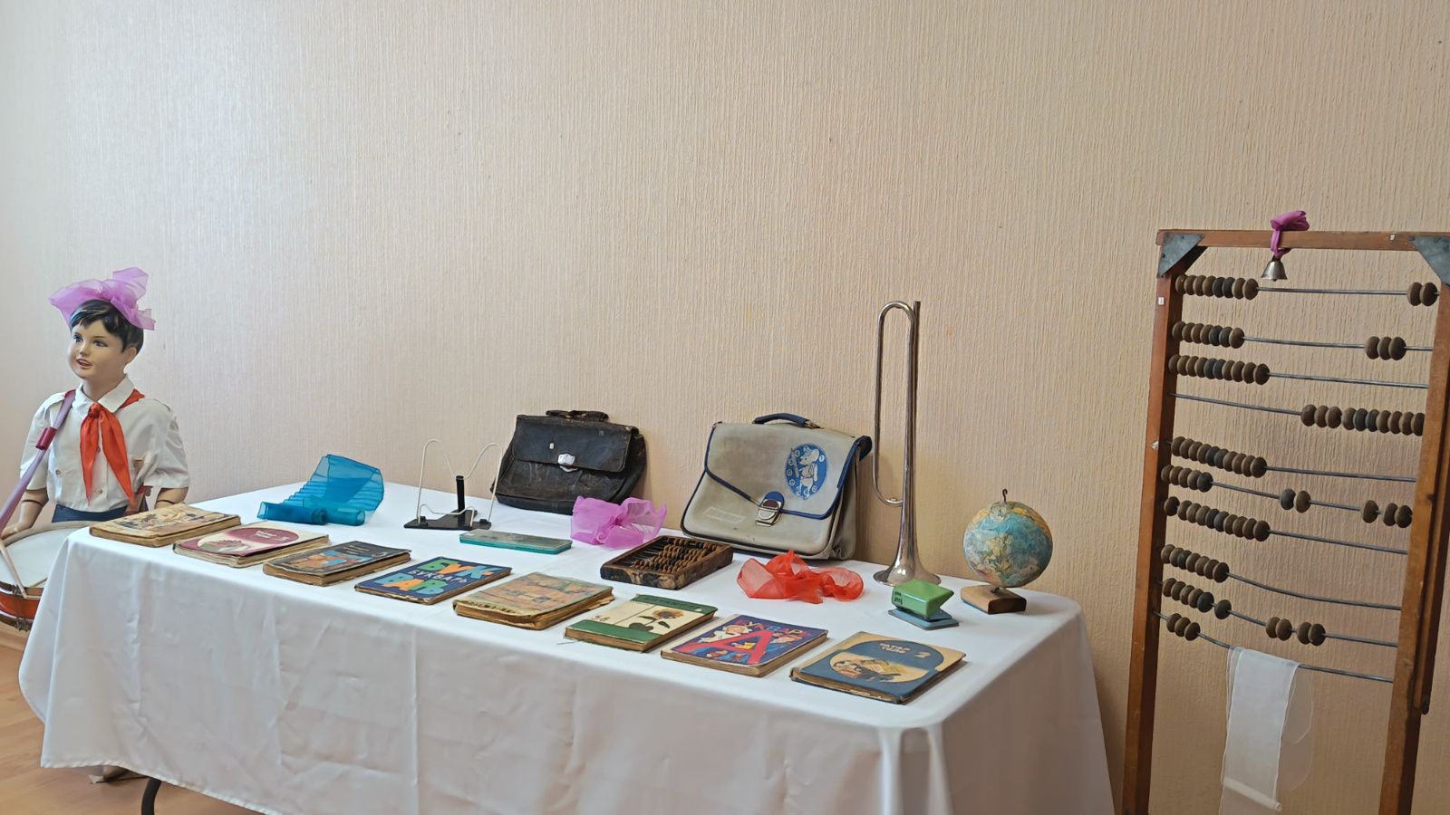 дәреслекләре, борынгы счетлар, глобуслар, портфельләр һәм балалар кулының